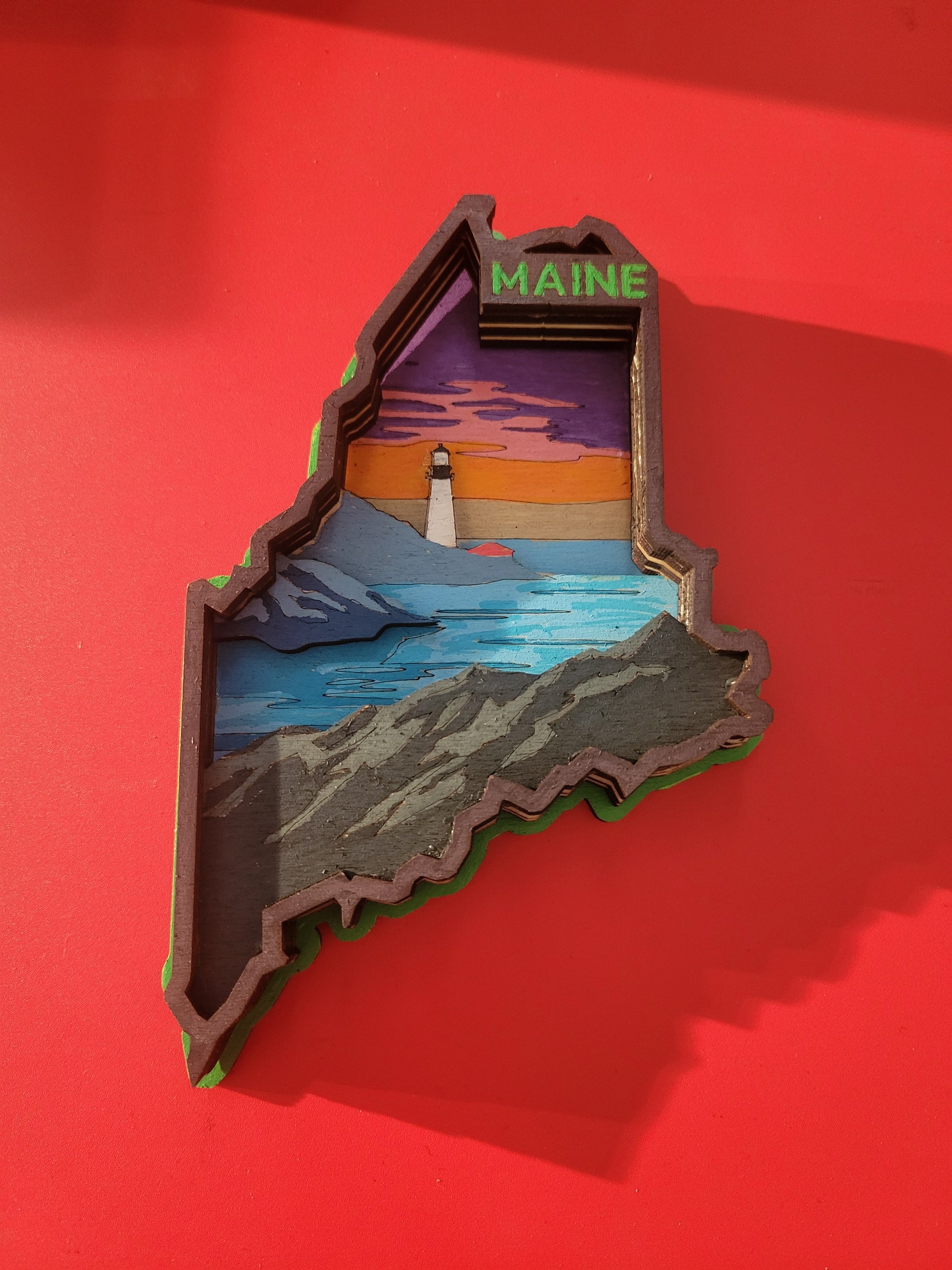 This expertly crafted State of Maine is made with laser-cut precision and hand-painted detail. Show off your love for this beautiful state with this unique decor piece. Perfect for any home or office, this piece adds a touch of sophistication and pride to any space.