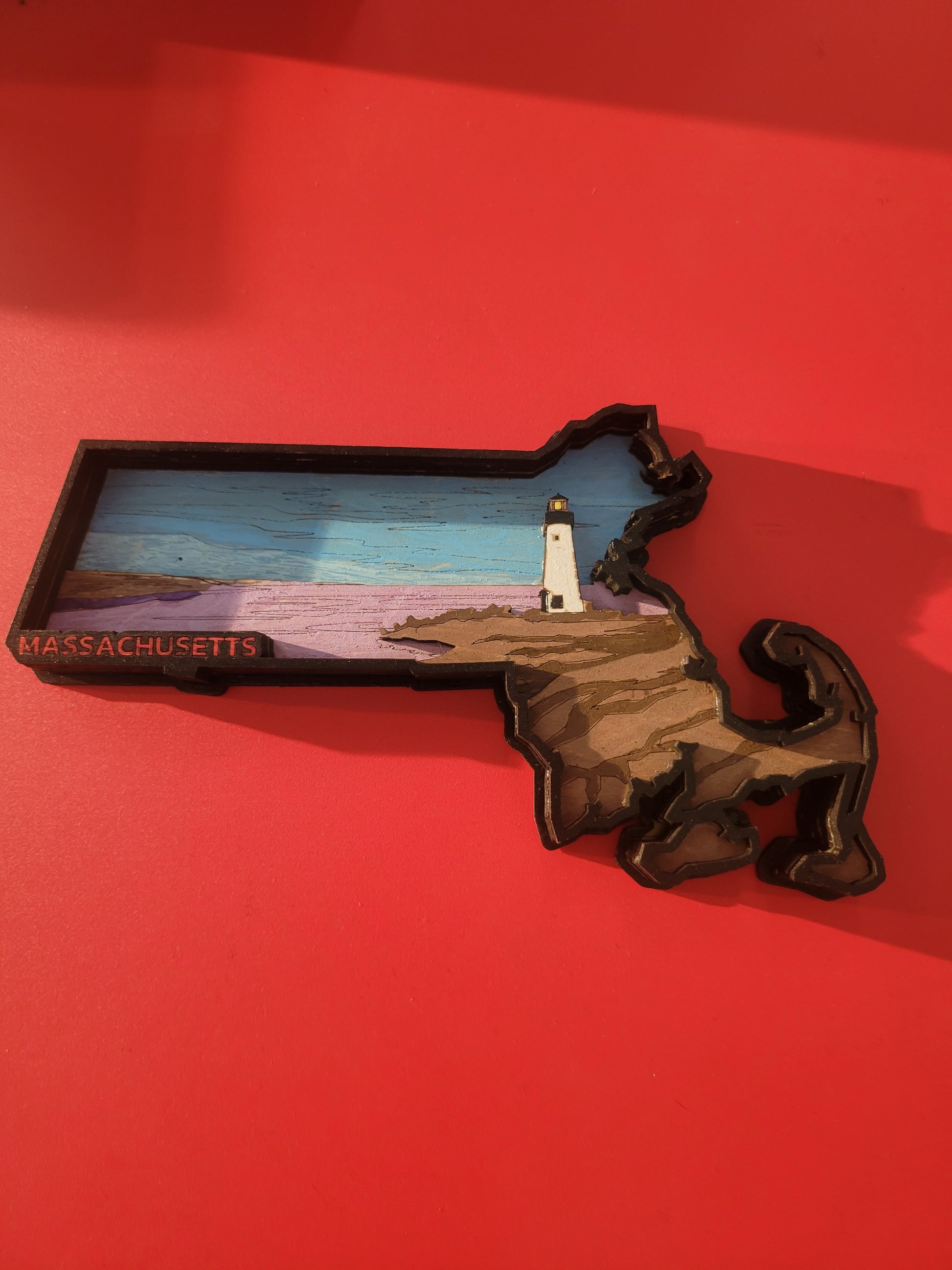 This laser cut State of Massachusetts is hand painted, making it a one-of-a-kind piece for any home or office. Show your state pride in a unique and quirky way. A fun and playful addition to any décor. (No two pieces are exactly alike!)